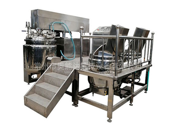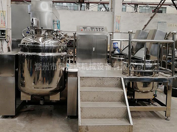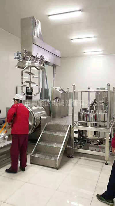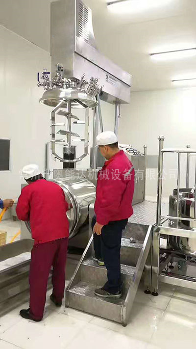 物料在水锅、油锅内通过加热、搅拌进行混合反应后,由真空泵吸入乳化锅,通过乳化锅内上部的中心搅拌、聚四氟乙烯刮板始终迎合搅拌锅形体,扫净挂壁粘料,使被刮取的物料不断产生新界面,再经过叶片的剪断、压缩、折叠,使其搅拌、混合而向下流往锅体下方的均质器处,物料再通过高速旋转的切割轮与固定的切割套之间所产生的强力的剪断、冲击、乱流等过程,物料在剪切缝中被切割,迅速破碎成200um-0.2um的微粒,由于乳化锅内处于真空状态,物料在搅拌过程中产生的气泡被及时抽走。采用抽真空的方式,使所生产的制品在搅拌过程中不再混入气泡,从而保证可制造出富有光泽、细腻及延展性良好的产品。