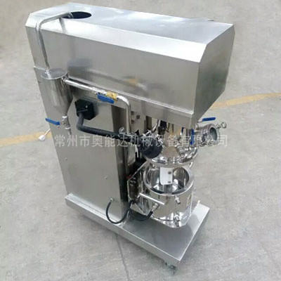 行星分散混合机有高速、低速、活动刮板作搅拌、剪切、刮壁、溶解用。低速运转的搅拌锚使物料在密闭容器内上下翻动、剪切和混合,高速运转的齿形分散盘与混合的物料产生强烈的碰击和剪切,随着搅拌锚的旋转,行星架上的活动刮刀随着旋转,把釜体上的物料完全刮掉,使聚集物完全、彻底地达到混合、分散、溶解的要求。在其高低速的不同作用下,使物料能够达到均匀的混合和分散。